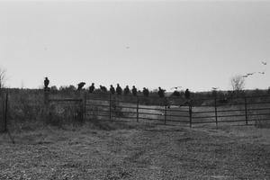 Shot on Ilford Plus 400 film, this black and white image leans into contrast and negative space. The wide, open sky stretches above them, emphasizing their small, dark silhouettes and the tension of their collective pause. The gravel road leads directly to the gate, creating a natural sense of approach, like you’ve arrived at a boundary and something is already waiting on the other side.