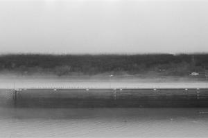 Shot on Ilford Plus 400 film, this black and white image emphasizes contrast, texture, and pattern. The layered elements of water, concrete, and tree line create a balanced, structured scene, softened slightly by a low layer of fog.