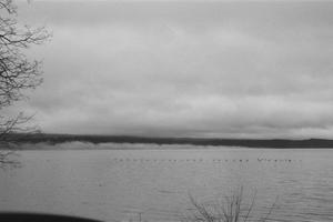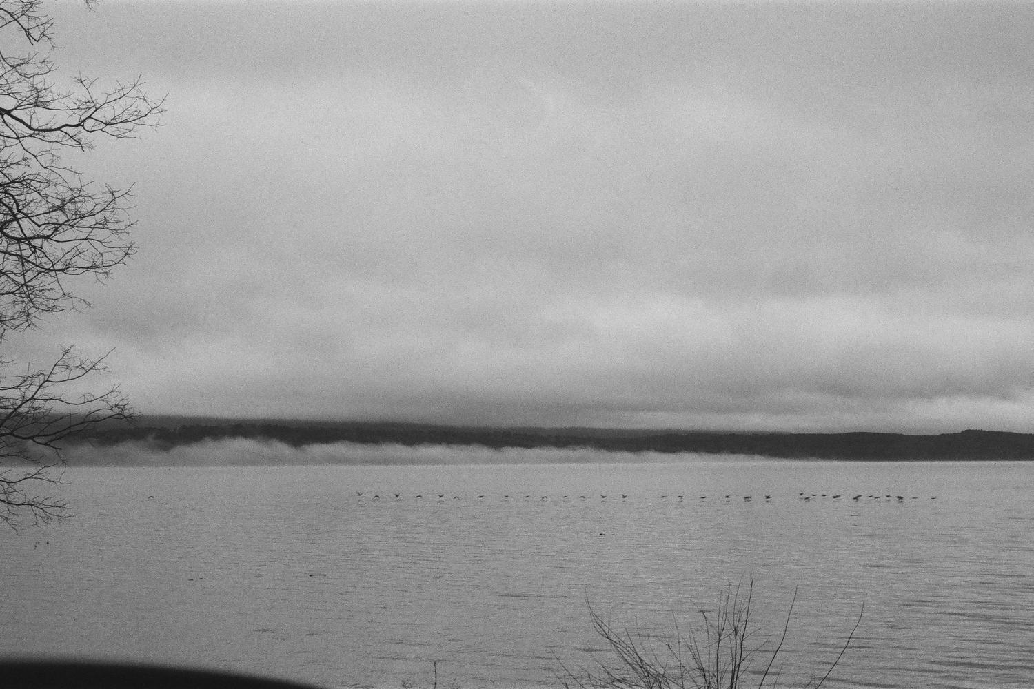 Low fog drifts across Lake Dardanelle, settling just above the waterline. A scattered line of birds floats in the distance, small against the wide, open surface. Shot on Ilford Plus 400 film, this black and white image focuses on subtle contrast and natural layering. The water, fog, and tree line create a calm horizon, while the bare branches at the edge of the frame add a sense of place and framing. A quiet, understated piece that works well in relaxed spaces, offering a sense of stillness without drawing too much attention.