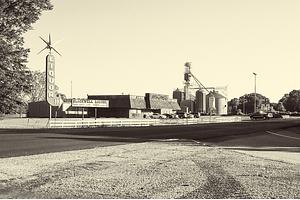 Behind the liquor store, a factory looms in the background, hinting at the industrial landscape that surrounds this rural area. This juxtaposition of the commercial and industrial sectors provides a unique perspective on the setting and the community it serves.