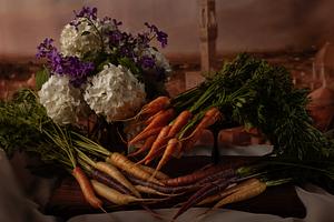 Immerse yourself in the captivating beauty of the "Spring Carrots" photo print, crafted in the classic Dutch Masters style. This enchanting composition transports you to a world of bountiful harvests and vibrant blossoms, evoking the essence of springtime.