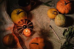 In this composition, a collection of small gourds takes center stage, their rich colors and intricate textures illuminated by the soft glow of candlelight. Handwritten notes on weathered paper add a touch of nostalgia, capturing the essence of introspective winter evenings.