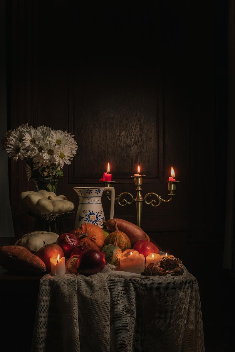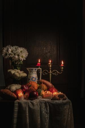 Several winter gourds, sweet potatoes, onions, baking spices, and decorations on a table covered in lace